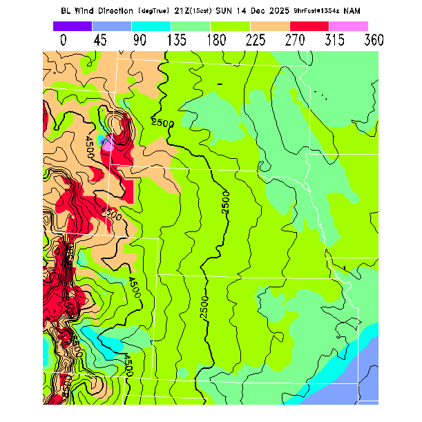 The direction of the vector-averaged wind in the BL.  This prediction can be misleading if there is a large change in wind direction through the BL (for a complex wind profile, any single number is not an adequate descriptor!).  Note that there will be a abrupt artificial gradient at the "cross-over" between 0 and 360 degrees.  MoreInfo