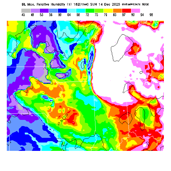 This parameter provides an additional means of evaluating the formation of clouds within the BL and might be used either in conjunction with or instead of the other cloud prediction parameters.  Larger values indicate greater cloud probability, but use of this parameter must be empirical since no theoretical guidance is available - for example, pilots must determine by actual experience the percentage that correlates with formation of clouds above local mountains.  The cloud base height is not predicted, but is expected to be below the TI=0 height.  MoreInfo