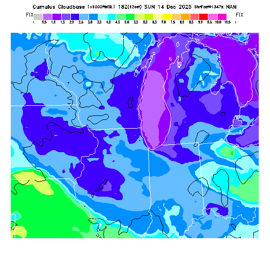 This evaluates the potential for small, non-extensive "puffy cloud" formation in the BL, being the height difference between the surface-based LCL (see below) and the BL top.  Small cumulus clouds are (simply) predicted when the parameter positive, but it is quite possible that the threshold value is actually greater than zero for your location so empirical evaluation is advised.  I would be interested in receiving end-of-season reports on what threshold value worked for your site.  Clouds can also occur with negative values if the air is lifted up the indicated vertical distance by flow up a small-scale ridge not resolved by the model's smoothed topography.  [This parameter is truncated at -10,000 for plotting.]   MoreInfo