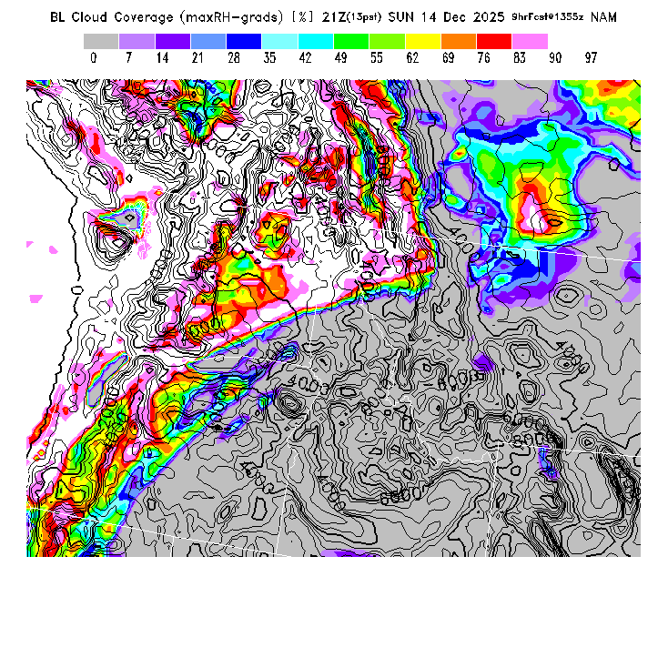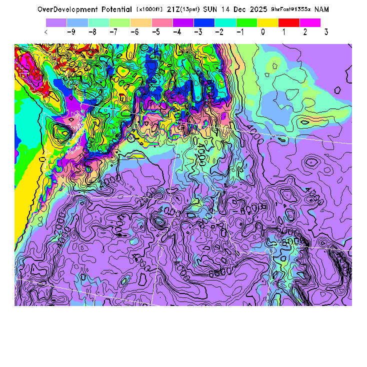 This evaluates the potential for extensive cloud formation (OvercastDevelopment) at the BL top, being the height difference between the BL CL (see below) and the BL top.  Extensive clouds and likely overcast development are predicted when the parameter is positive, with overcast development being increasingly more likely with higher positive values.  OvercastDevelopment can also occur with negative values if the air is lifted up the indicated vertical distance by flow up a small-scale ridge not resolved by the model's smoothed topography.  [This parameter is truncated at -10,000 for plotting.]   MoreInfo