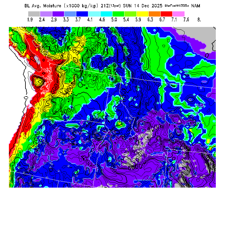 State outlines are depicted on each BLIPMAP in white.  The NAM topography is plotted as black contours, at 500 ft intervals with thicker lines at 2000 ft intervals, to assist in location identification but also to emphasize the smoothed nature of the model topography.  The BLIPMAP does not predict thermal lift created by small-scale terrain features which are not resolved by the model topography, which often give localized updrafts significantly stronger than those over the surrounding smoother terrain.