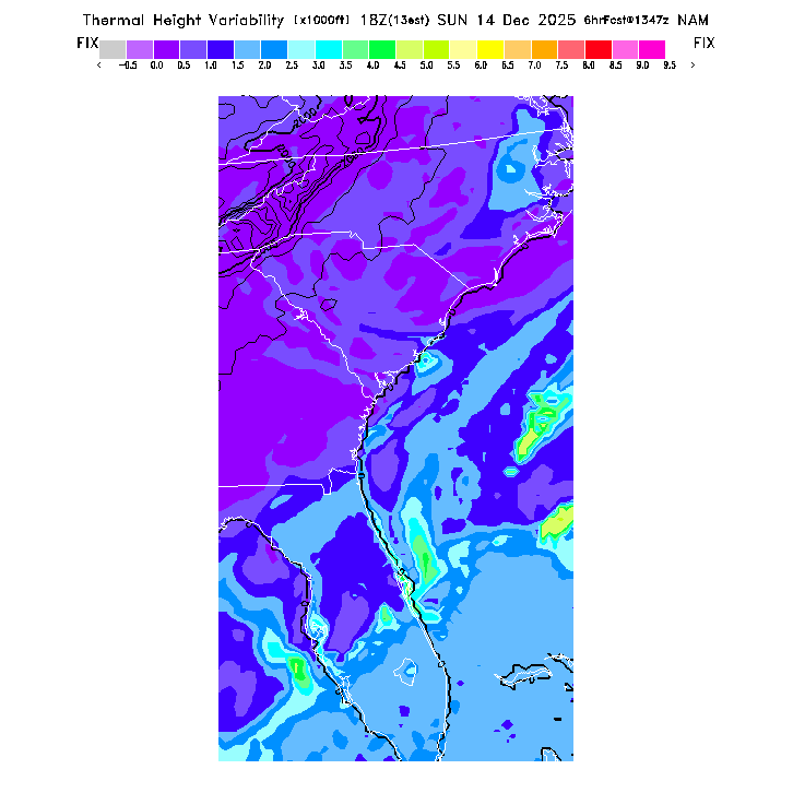 State outlines are depicted on each BLIPMAP in white.  The NAM topography is plotted as black contours, at 500 ft intervals with thicker lines at 2000 ft intervals, to assist in location identification but also to emphasize the smoothed nature of the model topography.  The BLIPMAP does not predict thermal lift created by small-scale terrain features which are not resolved by the model topography, which often give localized updrafts significantly stronger than those over the surrounding smoother terrain.