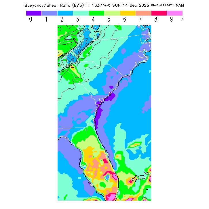 B/S Ratio stippling (dense=0-4 sparse=4-7) overlays Thermal Updraft Velocity contours to indicate where strong thermals can be broken by vertical wind shear.  See "Thermal Updraft Velocity" and "Buoyancy/Shear Ratio" parameter descriptions below for more information.