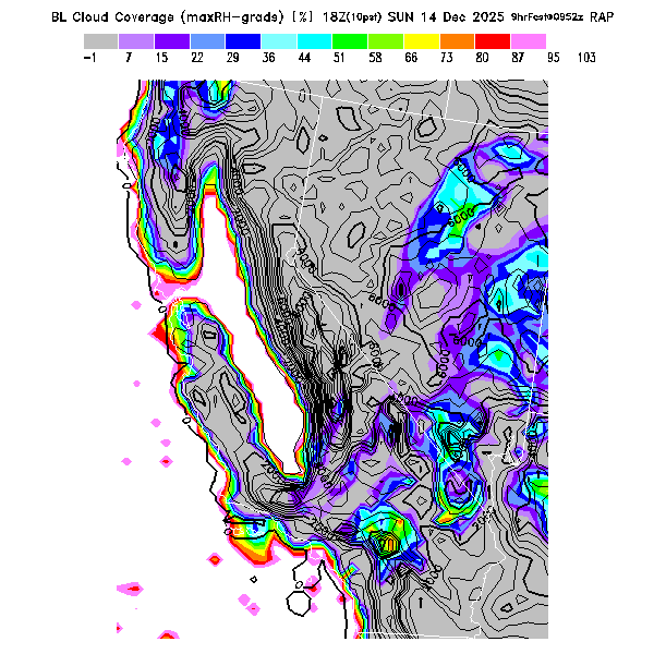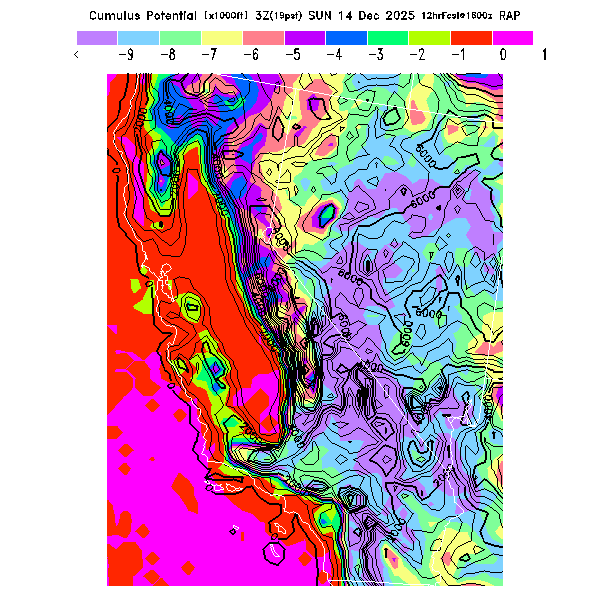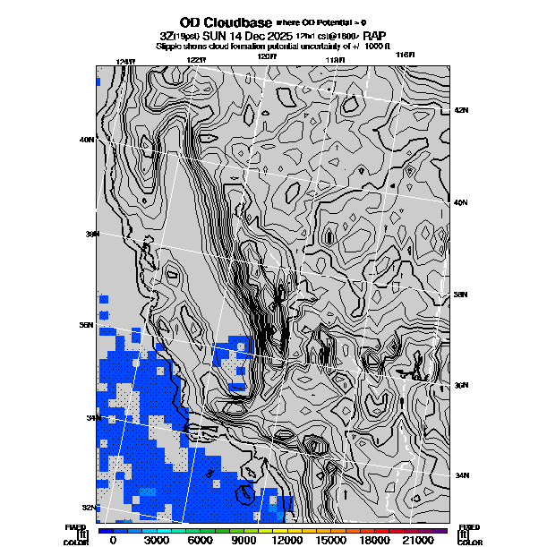 This evaluates the potential for extensive cloud formation (OvercastDevelopment) at the BL top, being the height difference between the BL CL (see below) and the BL top.  Extensive clouds and likely OvercastDevelopment are predicted when the parameter is positive, with OvercastDevelopment being increasingly more likely with higher positive values.  OvercastDevelopment can also occur with negative values if the air is lifted up the indicated vertical distance by flow up a small-scale ridge not resolved by the model's smoothed topography.  [This parameter is truncated at -10,000 for plotting.]   MoreInfo