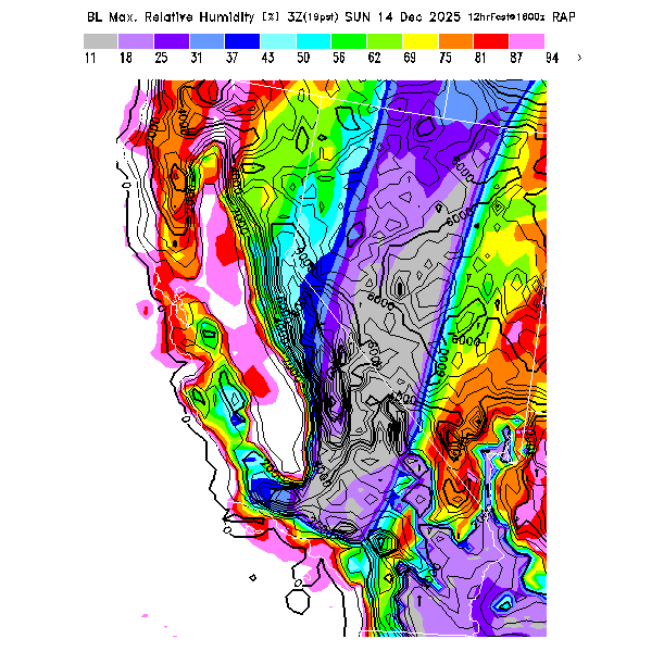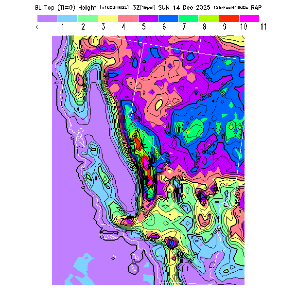 State outlines are depicted on each BLIPMAP in white.  The RAP topography is plotted as black contours, at 500 ft intervals with thicker lines at 2000 ft intervals, to assist in location identification but also to emphasize the smoothed nature of the model topography.  The BLIPMAP does not predict thermal lift created by small-scale terrain features which are not resolved by the model topography, which often give localized updrafts significantly stronger than those over the surrounding smoother terrain.  Maps of location identifiers and additional topography information for this region are available at the CANV Grid Orientation webpage.