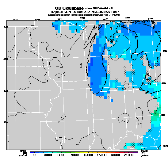 OvercastDevelopment Cloudbase Cloudbase contours are plotted only where that cloudbase is theoretically expected.  See "OvercastDevelopment Potential" and "OvercastDevelopment Cloudbase" parameter descriptions below for more information.  This composite is useful only for locations where the actual potential threshold for OD cloud production agrees with the theoretically-predicted value of zero.