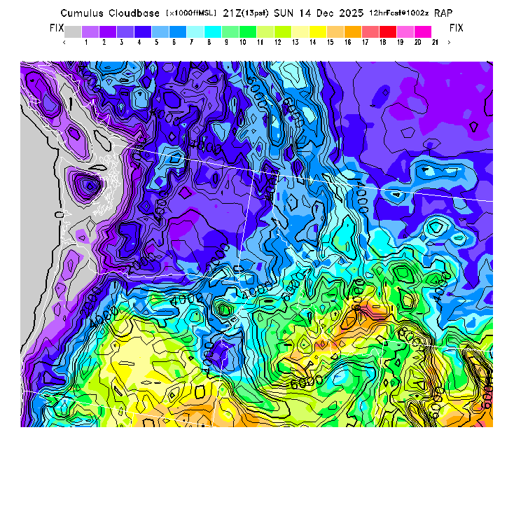 State outlines are depicted on each BLIPMAP in white.  The RAP topography is plotted as black contours, at 500 ft intervals with thicker lines at 2000 ft intervals, to assist in location identification but also to emphasize the smoothed nature of the model topography.  The BLIPMAP does not predict thermal lift created by small-scale terrain features which are not resolved by the model topography, which often give localized updrafts significantly stronger than those over the surrounding smoother terrain.  Maps of location identifiers and additional topography information for this region are available at the NW Grid Orientation webpage.