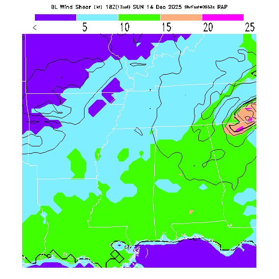 The magnitude of the vector wind difference between the top and bottom of the BL.  Note that this represents vertical wind shear and does not indicate "shear lines" (which are horizontal changes of wind speed/direction).  MoreInfo