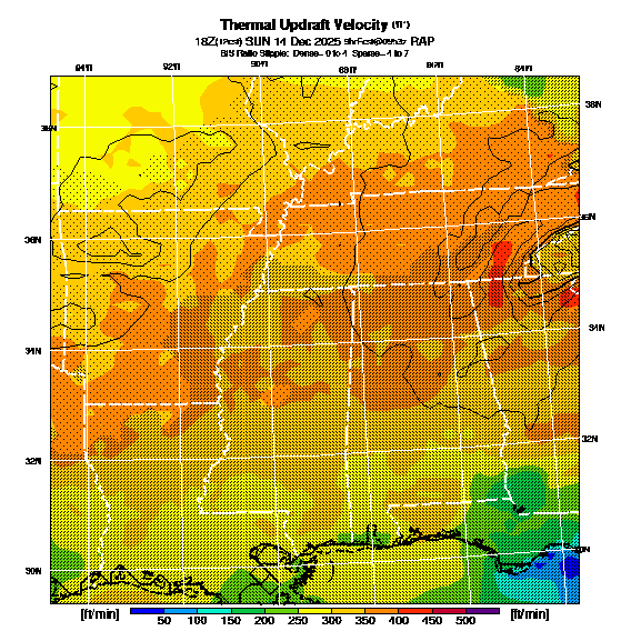 B/S Ratio stippling (dense=0-4 sparse=4-7) overlays Thermal Updraft Velocity contours to indicate where strong thermals can be broken by vertical wind shear.  See "Thermal Updraft Velocity" and "Buoyancy/Shear Ratio" parameter descriptions below for more information.